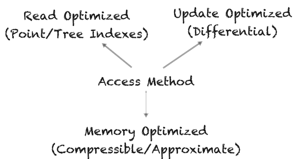 When building access methods of modern systems, one is confronted with the same fundamental challenges, and design decisions. In particular, there are three quantities that researchers always try to minimize: (1) the read overhead (R), (2) the update overhead (U), and (3) the memory (or storage) overhead (M), which we term RUM overheads. Deciding which overhead(s) to optimize for and to what extent, remains a prominent part of the process of designing a new access method, especially as hardware and workloads change over time. The design space of the three RUM overheads can be seen as a three dimensional space or, if projected on a two-dimensional plane, as the triangle shown in the left hand-side, where each access method is mapped to a point or -- if it can be tuned to have varying RUM behavior -- to an area.